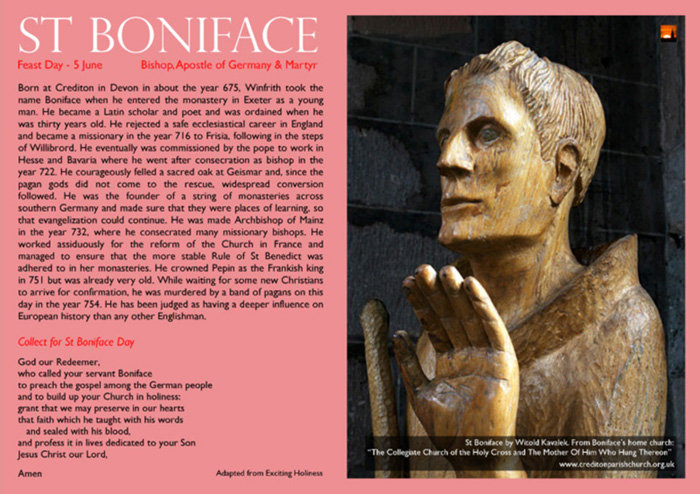 It is the light of Saint Boniface that inspired my work and leads us into new eras and nations. It was Saint Boniface who came to what is now Germany from England in the 6th Century as a missionary. He brought many to the Christian faith and was a Bishop. Centuries later the spirit of Saint Boniface still inspires the masses. It was spiritual light of Saint Boniface that was carried forth in glass lanterns attached to canal boats bringing German settlers (some of which where my ancestors) into what is now Ohio. Many of these settlers had very little in financial resources but two hands to work. Ohio and family history will tell that many German settlers would work in foundries and corn fields. Though by night the light of Saint Boniface would be shown again in gas lanterns on kitchen tables where German women would make lace, quilts and even church vestments for their local parishes. Today light comes by electric voltage into my studio but it is still the light of Saint Boniface that illuminates and inspires the artistic work of the hand.